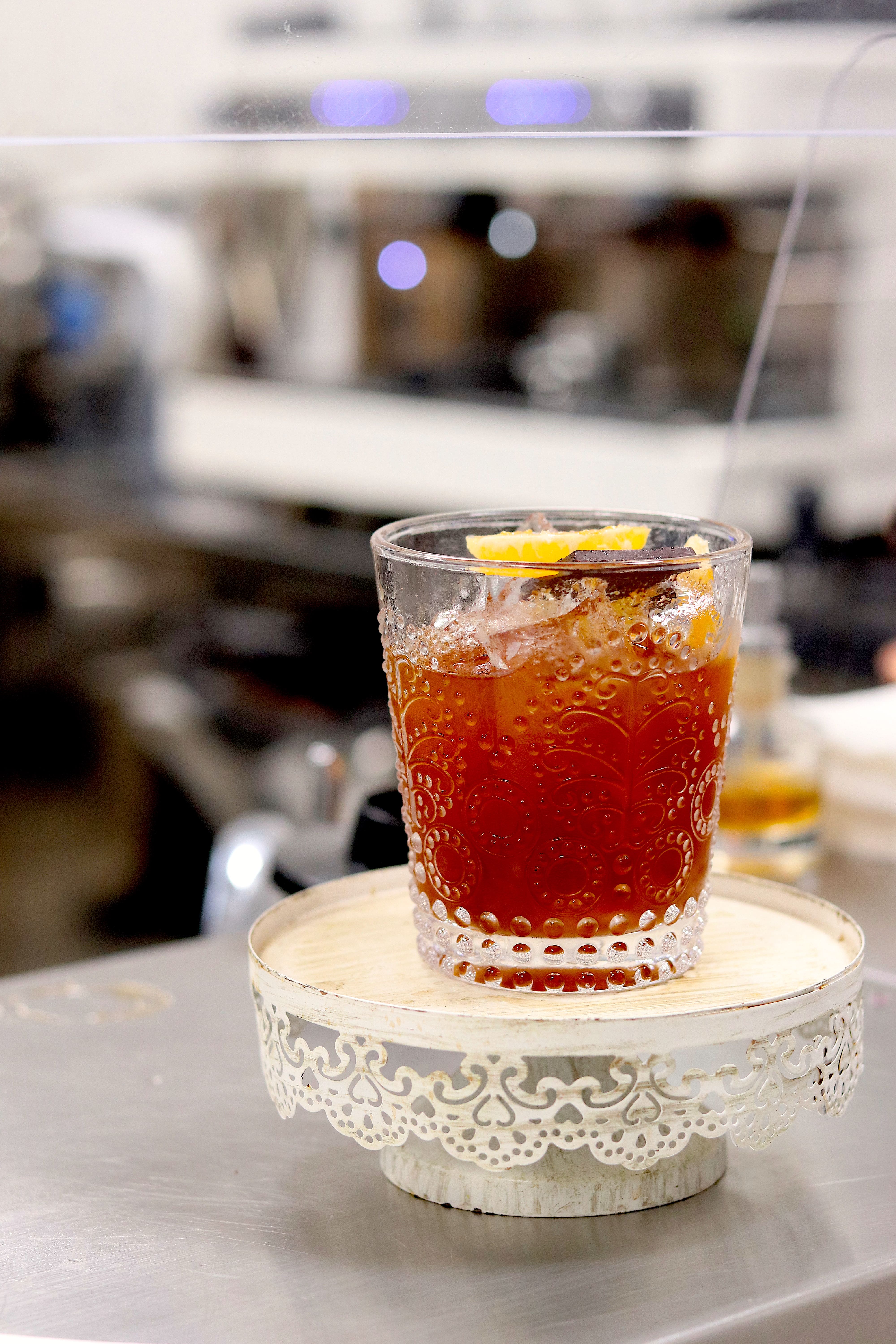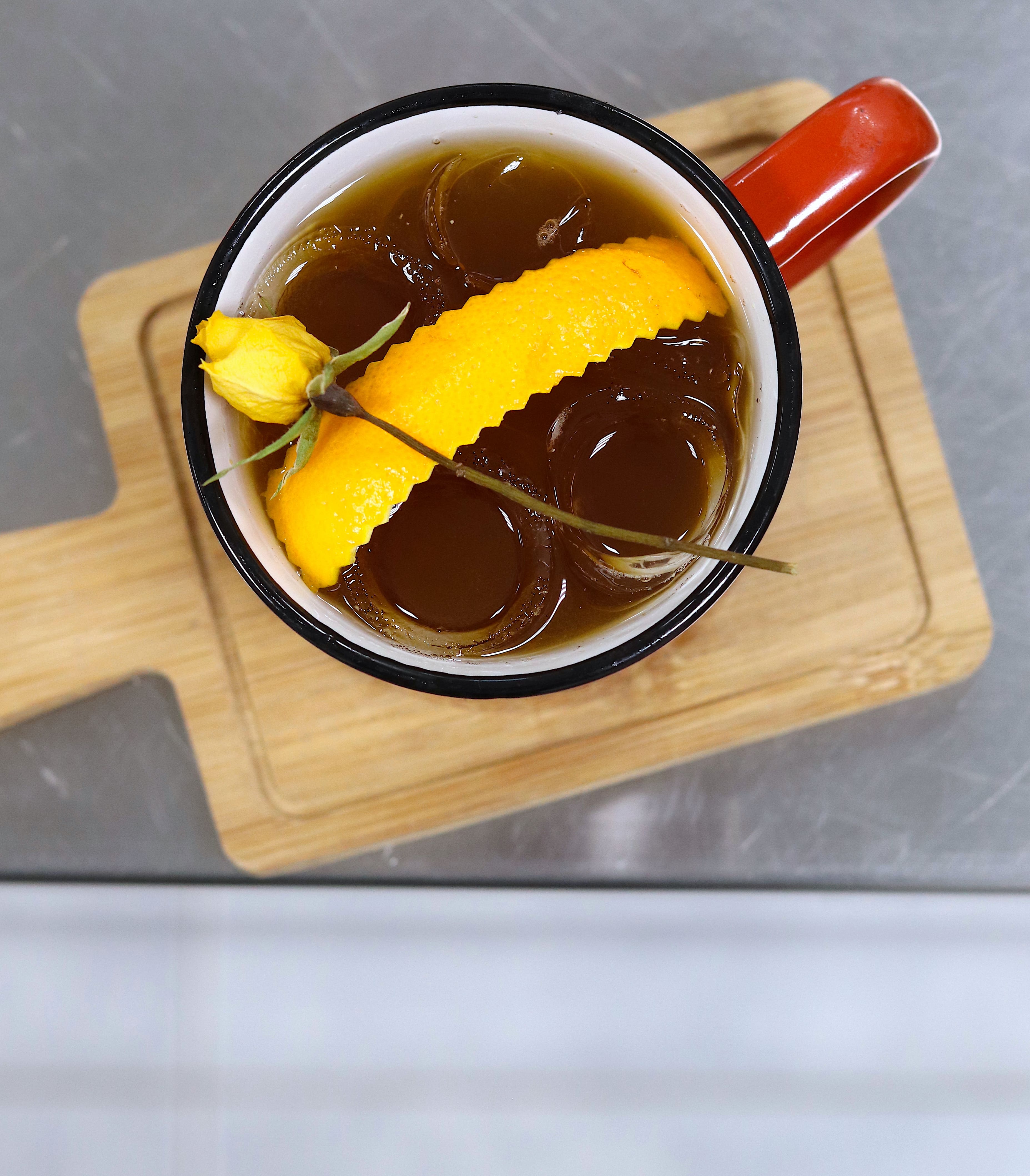 - LONDON MULE COFFEE: Sciroppo di zenzero, gin, amaro all’arancia di Sicilia, caffè estratto metodo cold brew, ghiaccio