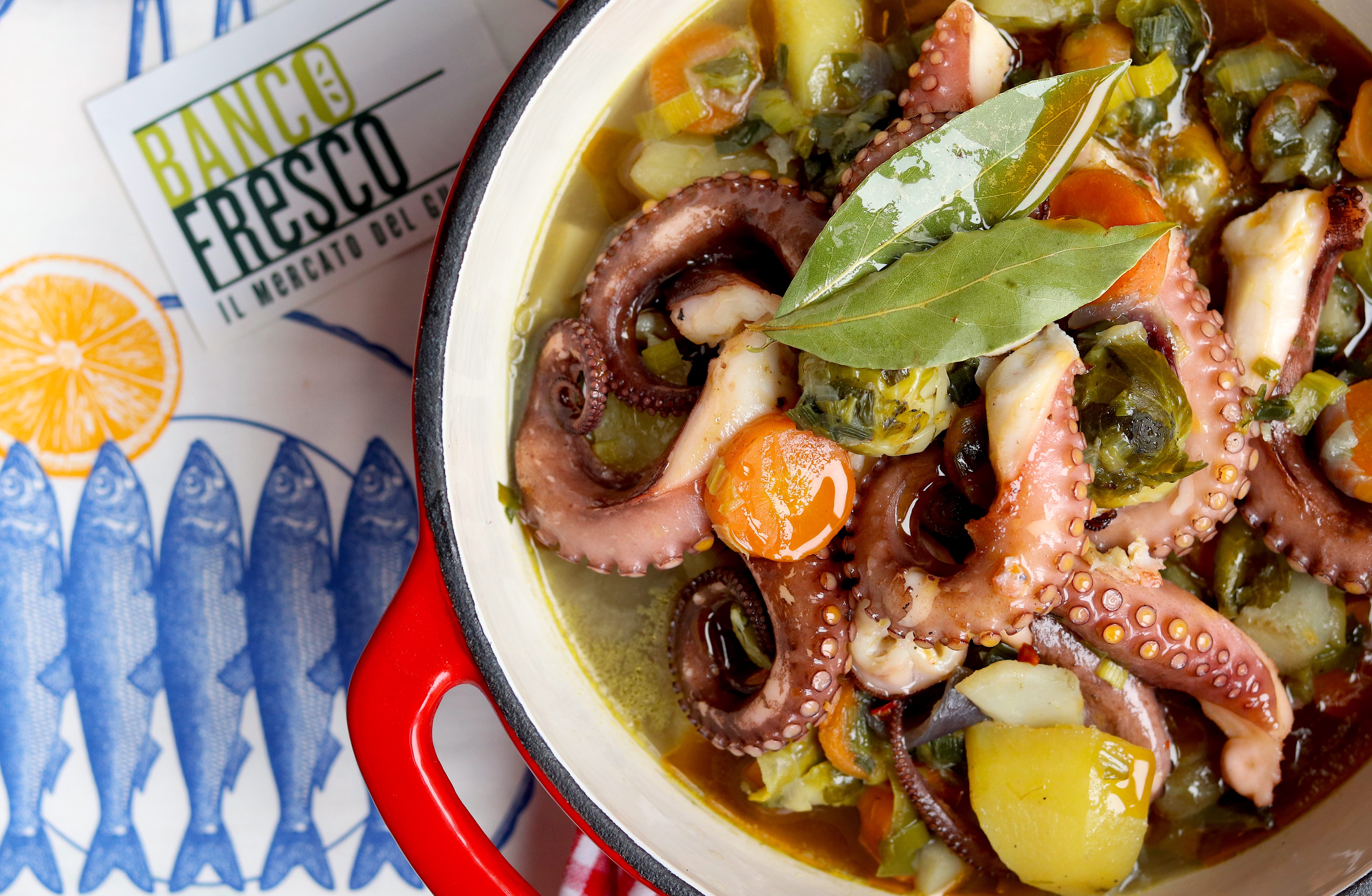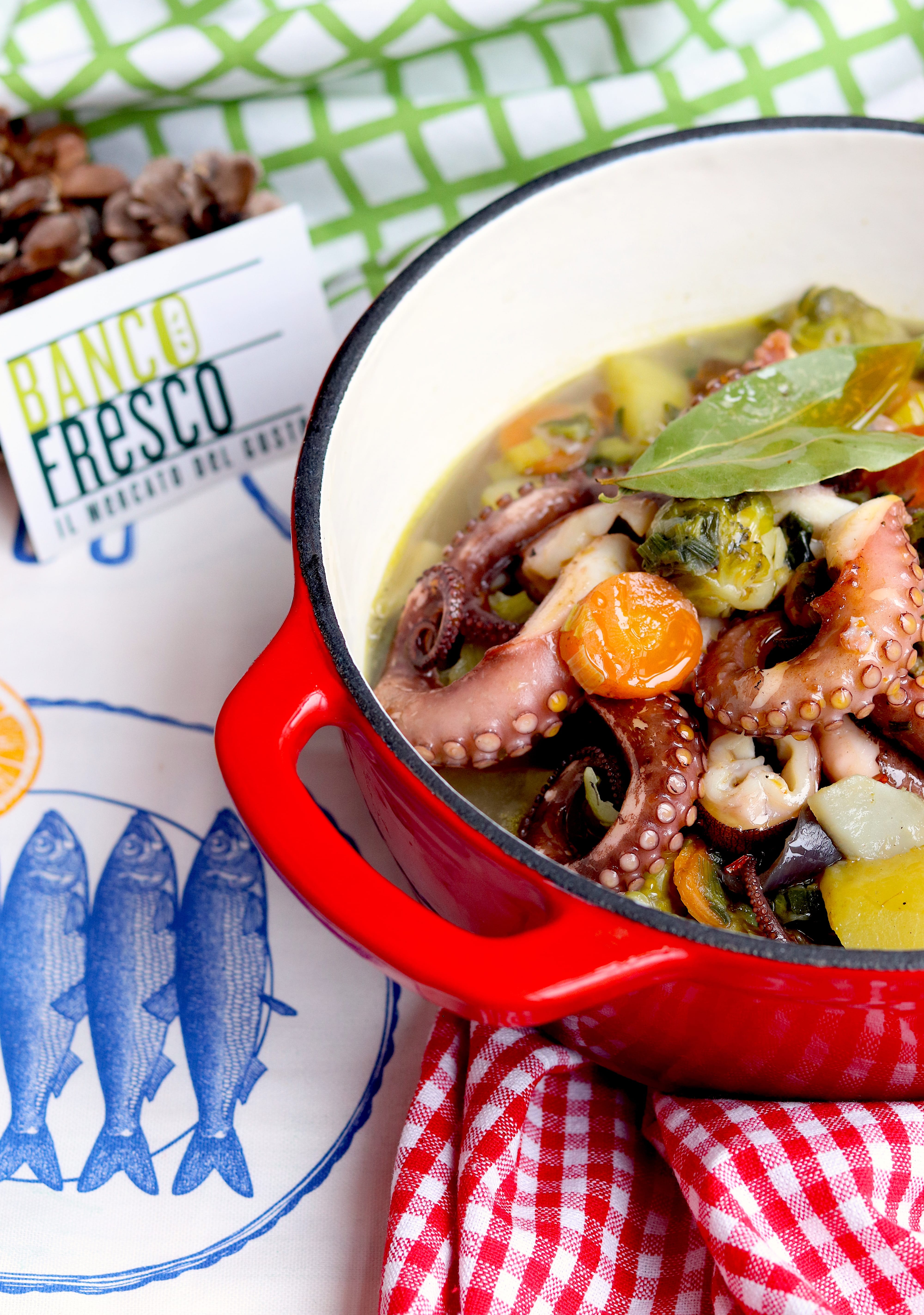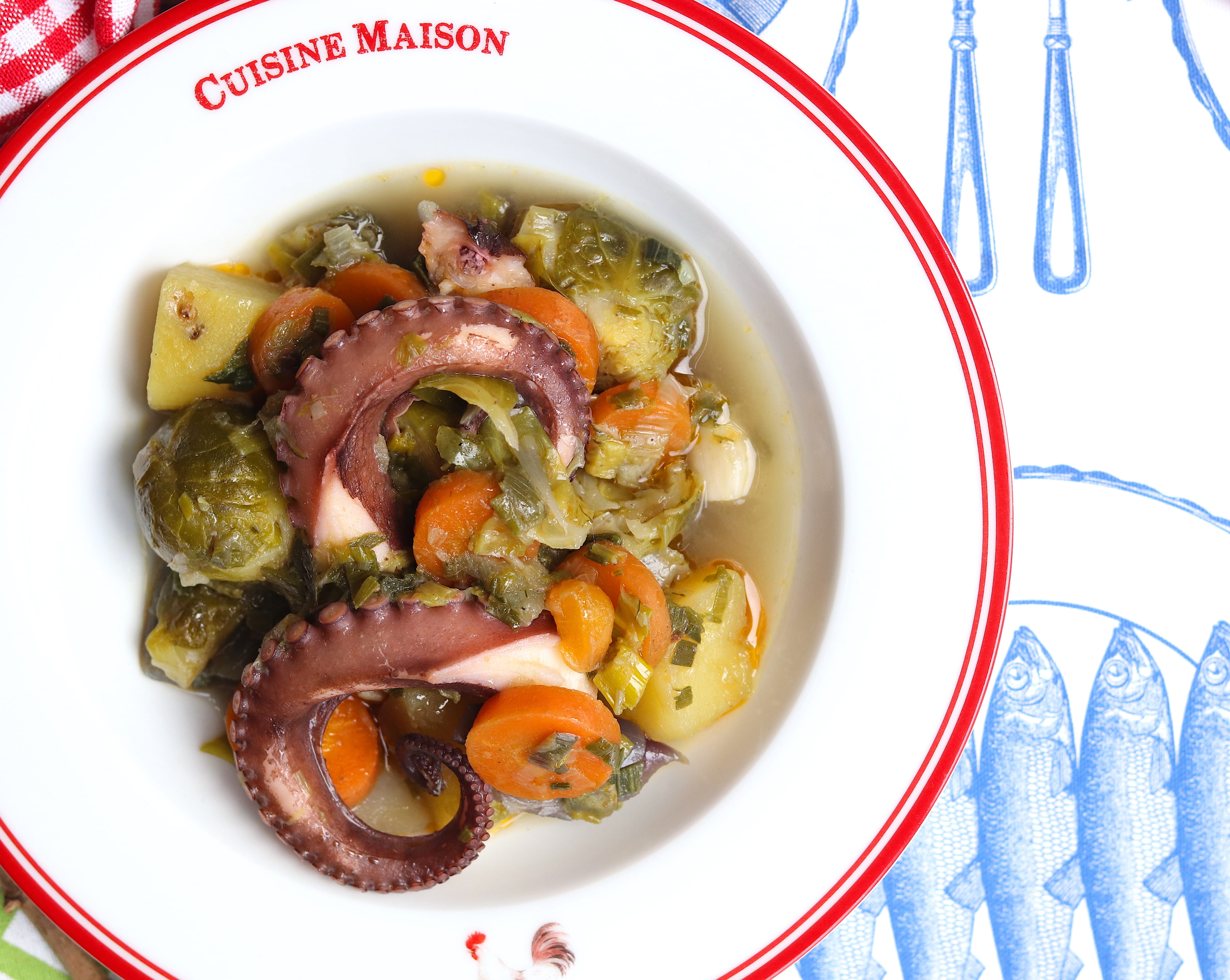 Perché il POT-AU-FEU (dal nome della pentola in cui si cuoce) tradizionale prevede la carne, specialmente manzo nei suoi diversi tagli. Da amante del pesce comprato da Banco Fresco, però, mi sono detta: perché non sostituire il manzo con il polpo? Risultato? Délicieux! Degno delle più belle fiabe francesi, dove per magia ti ritrovi con un calice di vin blanc in mano, un bistrot e un piatto caldo di pesce e verdure!