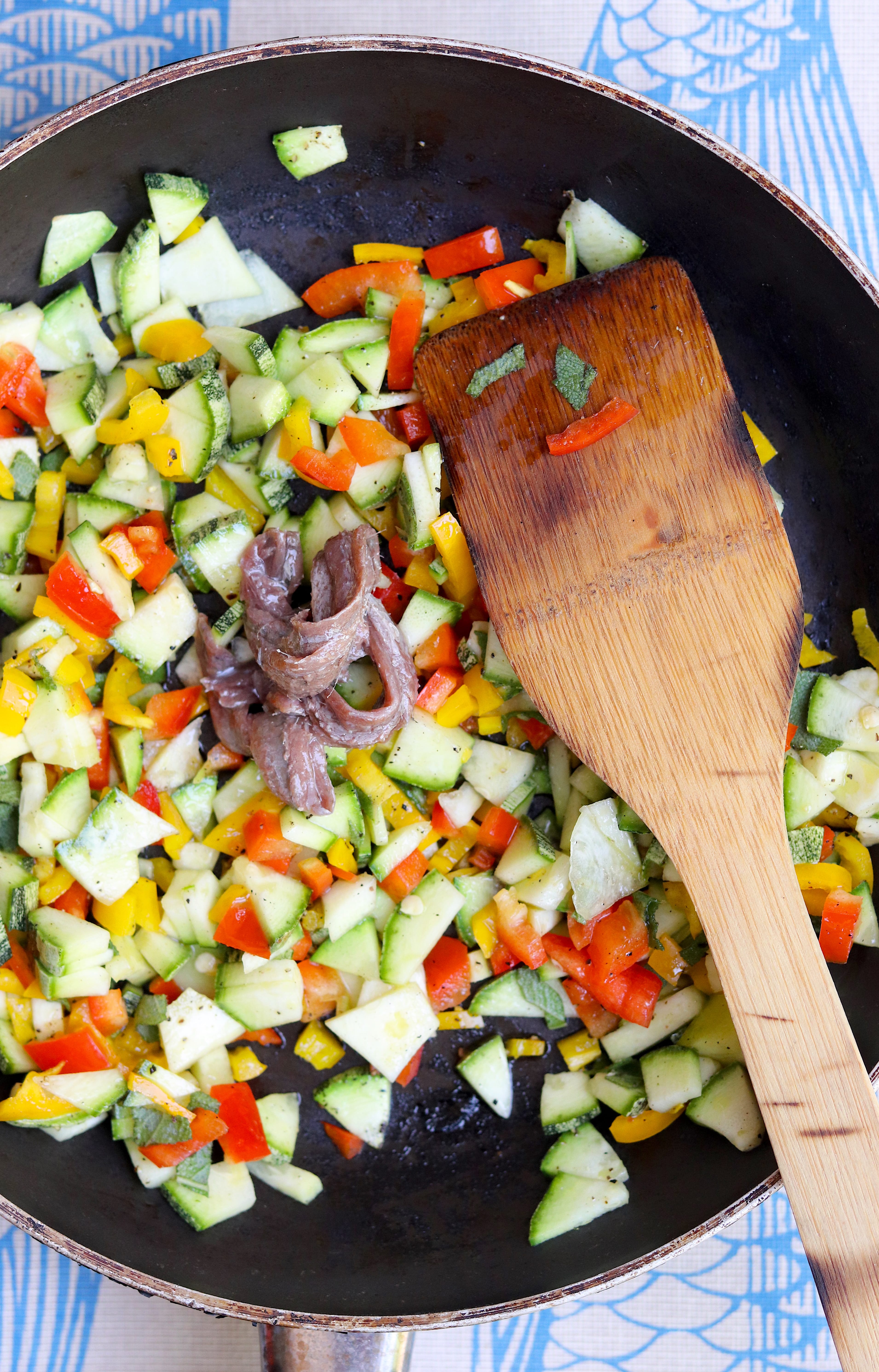 - In un tegame scaldate due cucchiai di olio con un pizzico di pepe, aggiungete le verdure e rosolate qualche minuto. Aggiungete le acciughe sgocciolate e cuocete fino a farle sciogliere (aggiungete acqua se necessario).