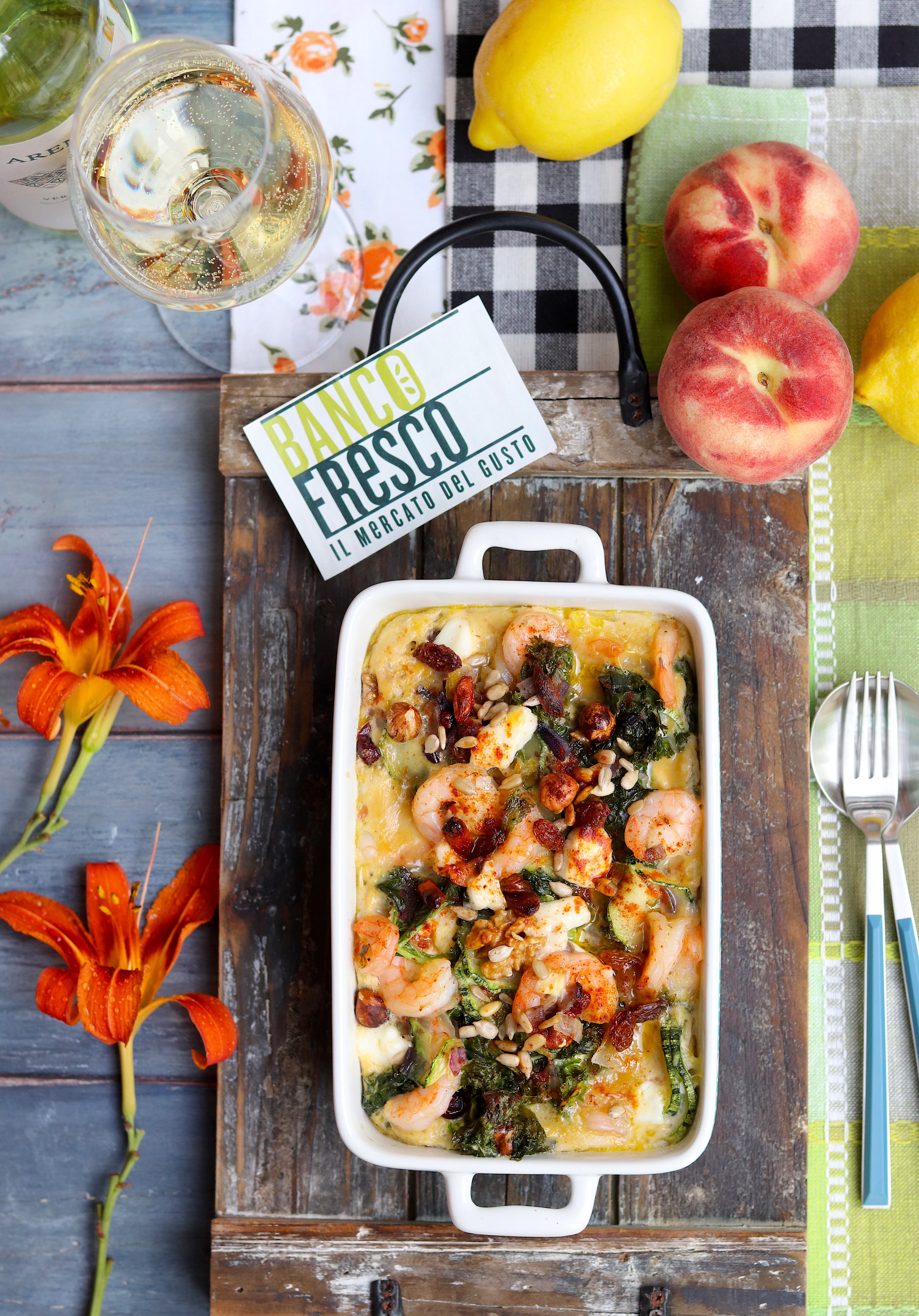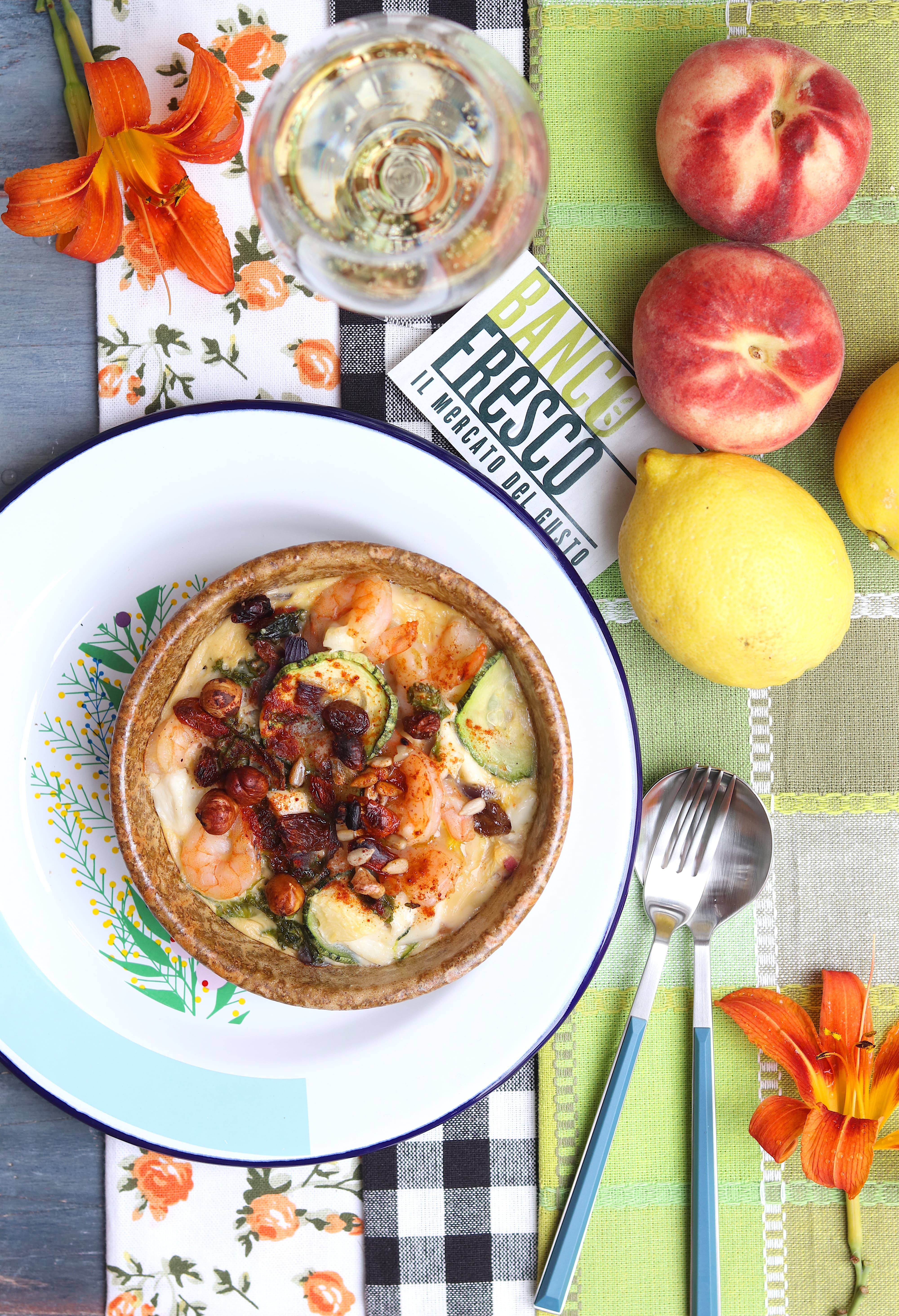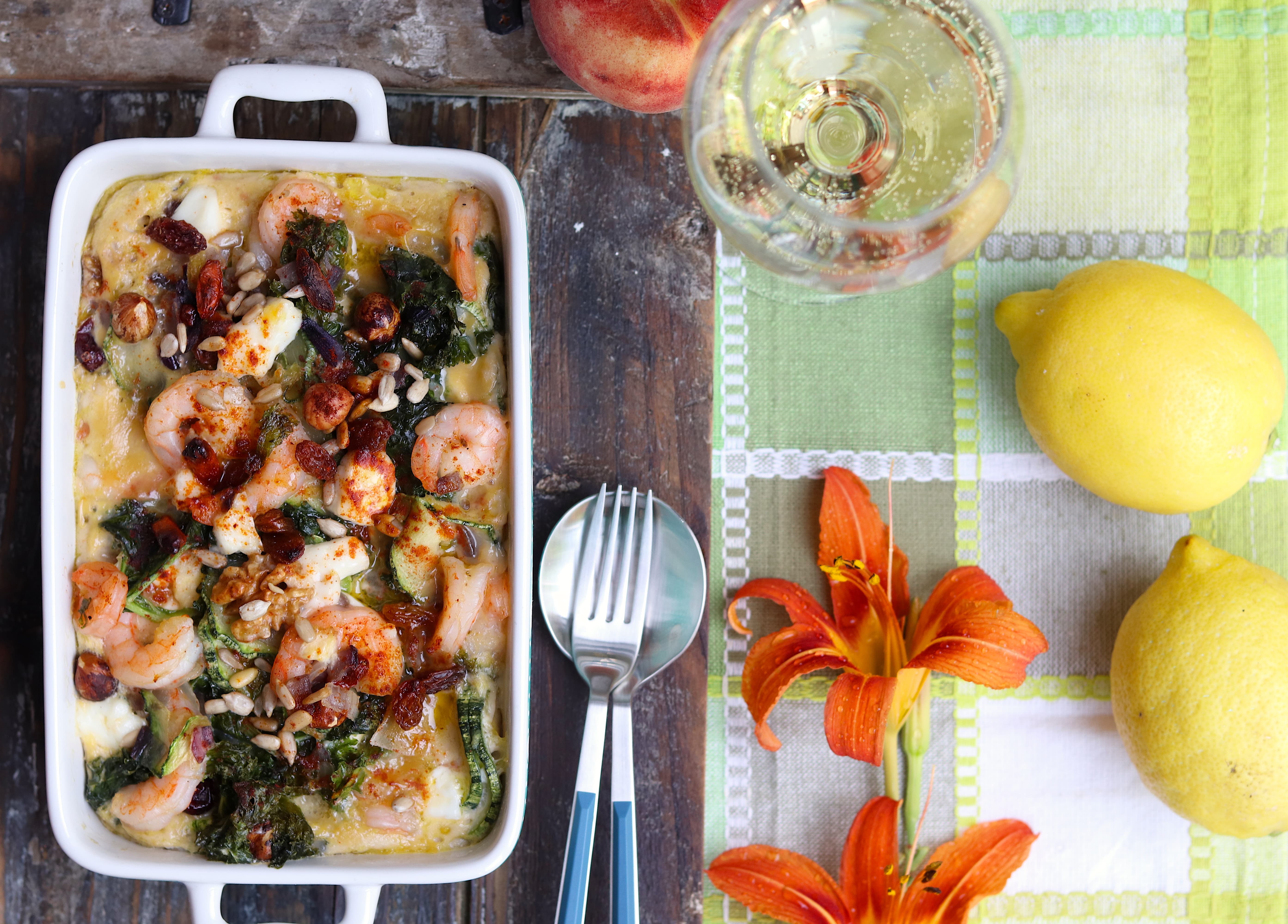 CLAFOUTIS DI GAMBERI E FORMAGGIO DI CAPRA, KALE E PESCHE