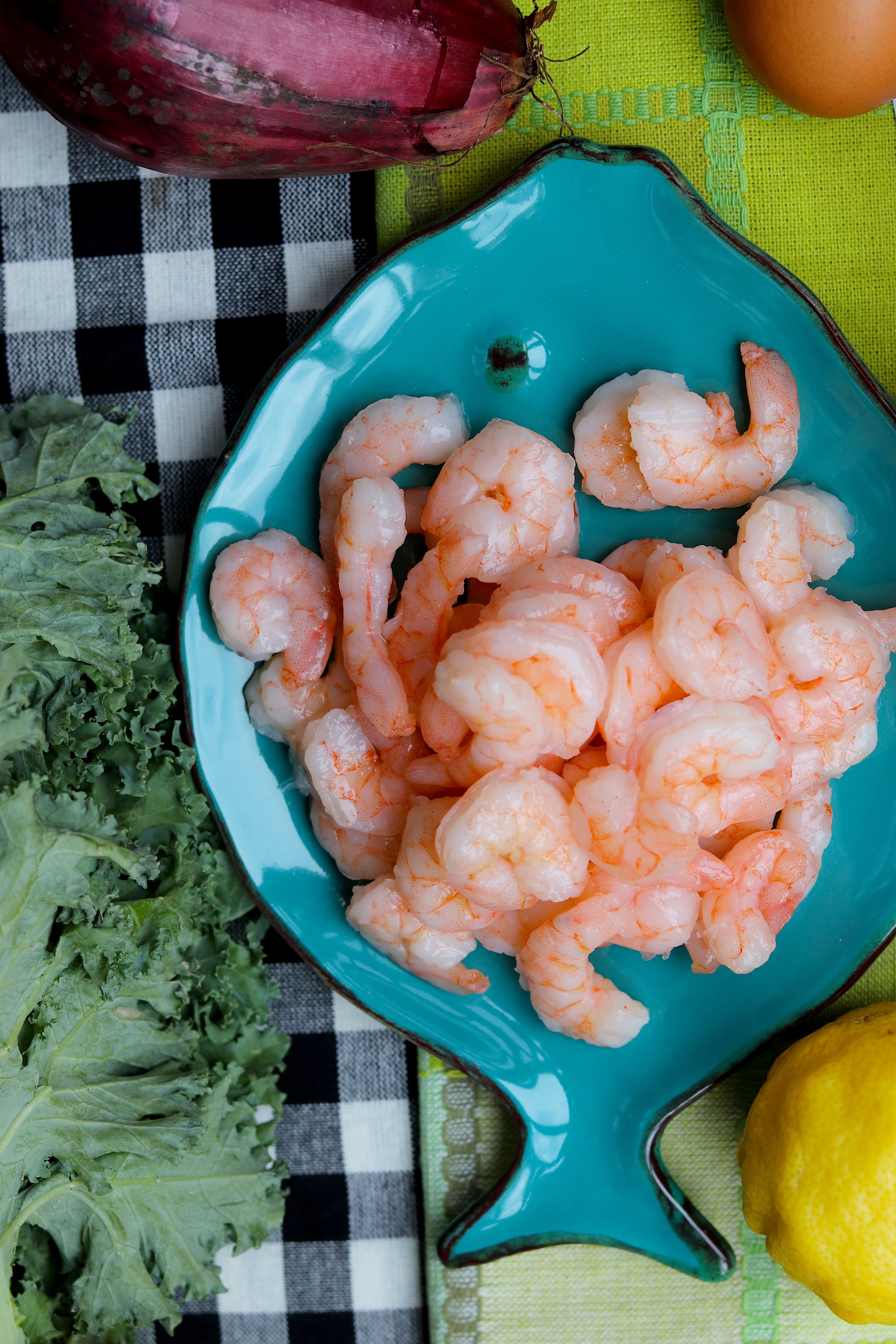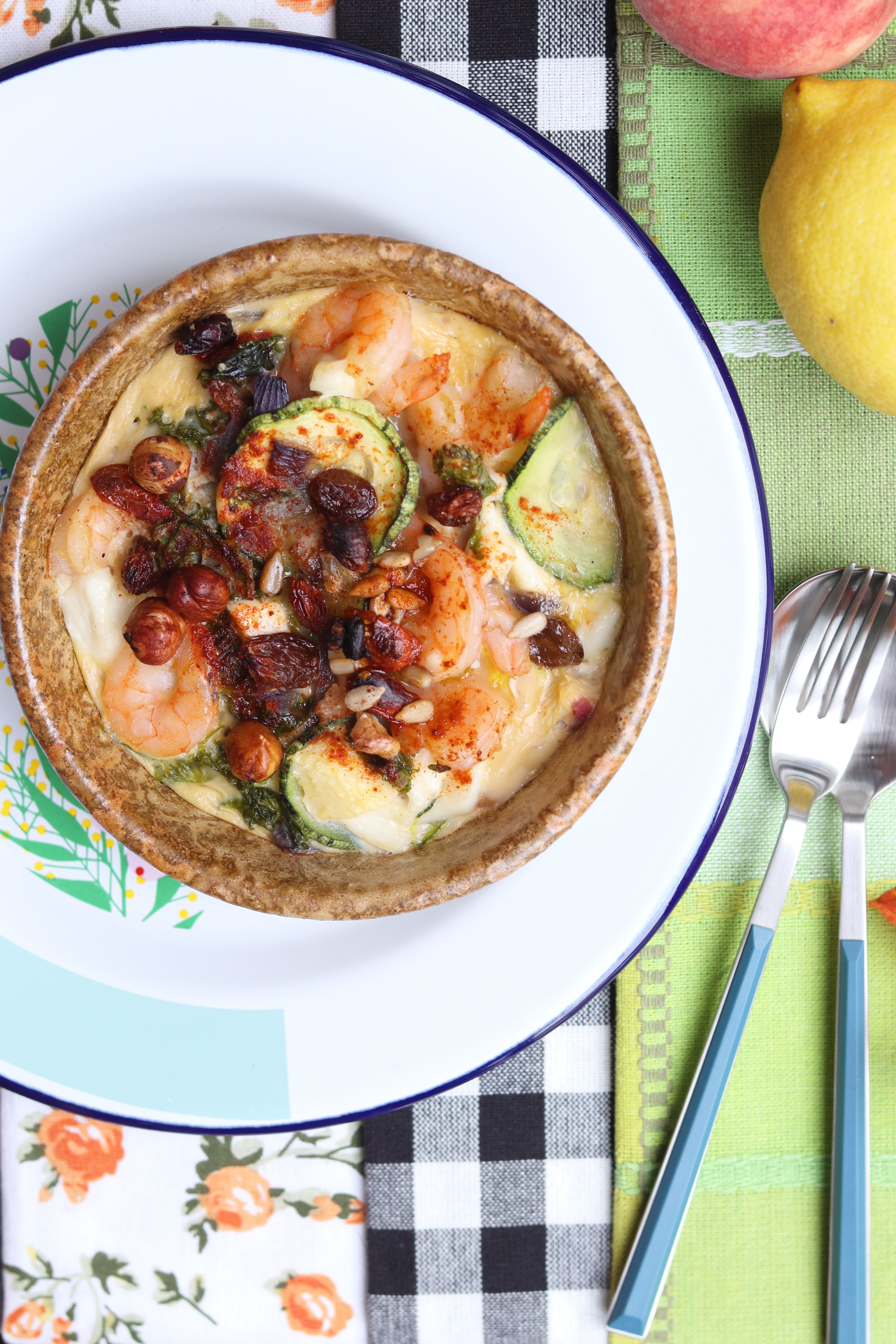 - In una ciotola sbattete le uova con il latte, sale e pepe. Unite la capra, la pesca a cubetti, la frutta secca e mescolate bene. Aggiungete le verdure e i gamberi al composto, la paprica e mescolate bene.