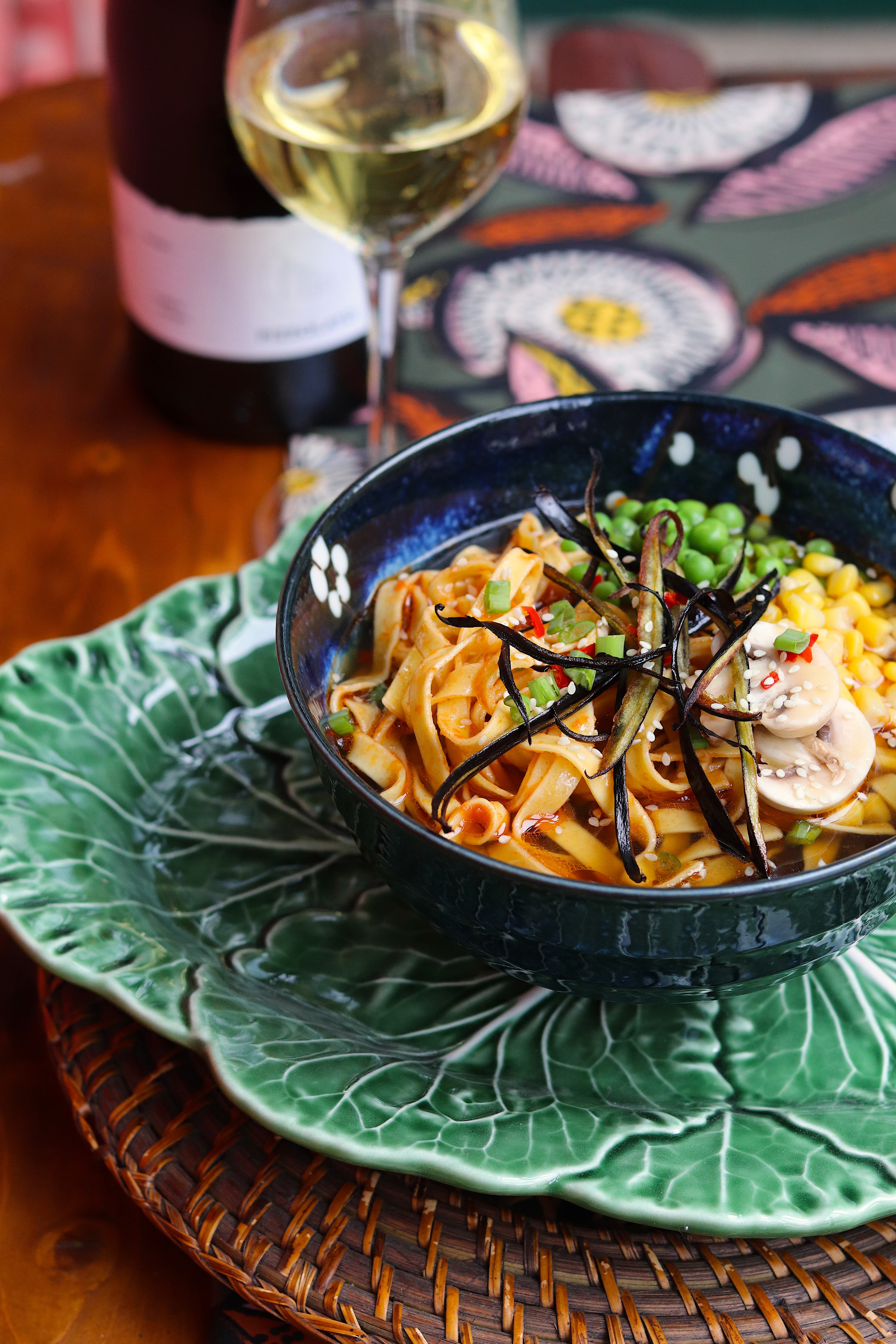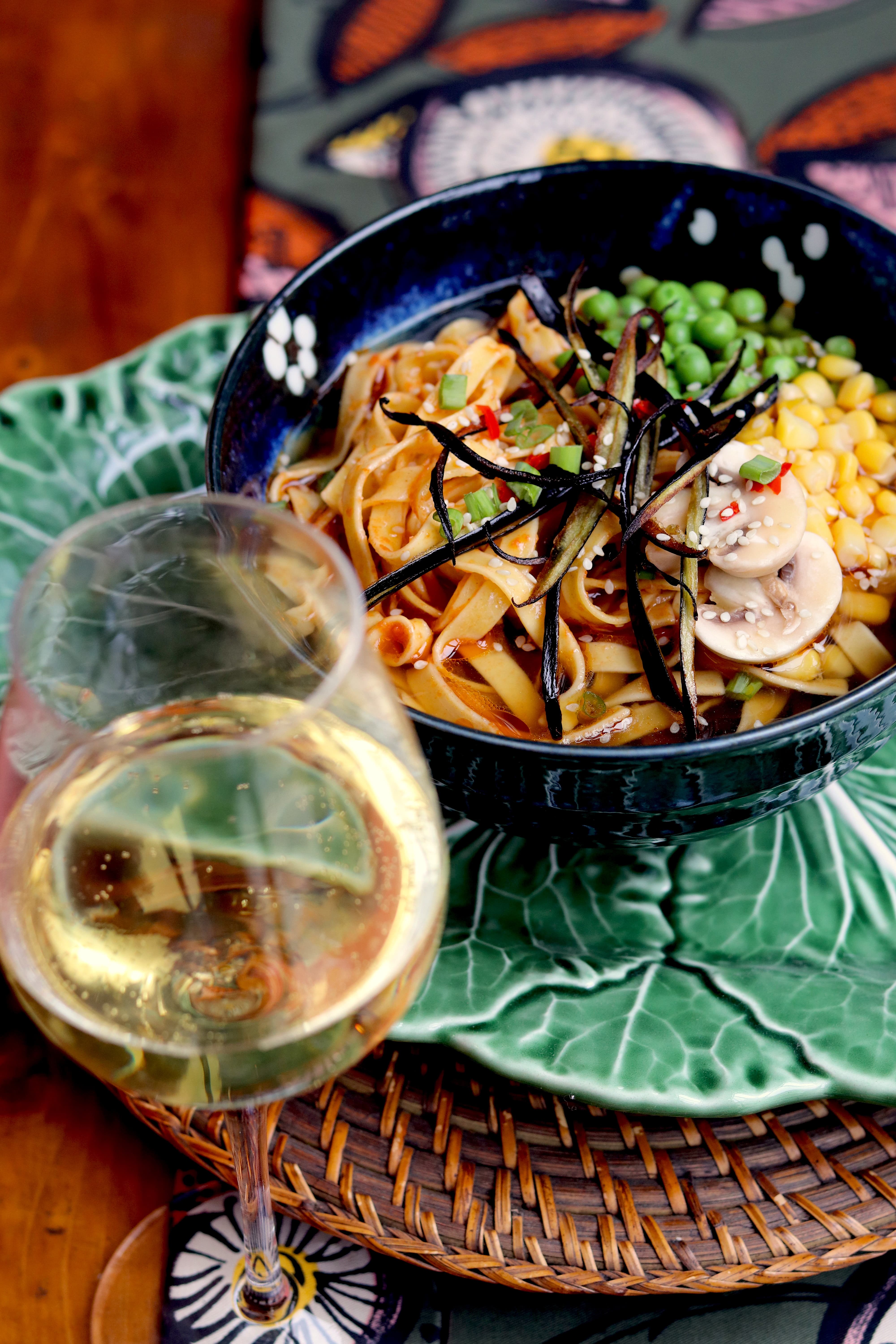 Oggi il Manzoni Bianco DOC incontra un piatto Nikkei. Il Ramen giapponese e la pasta di Rocoto (peperoncino piccante) peruviana creano un piatto che unisce culture e tradizioni lontane, accomunate però dalla semplicità e dal piacere di una cucina vegetale.