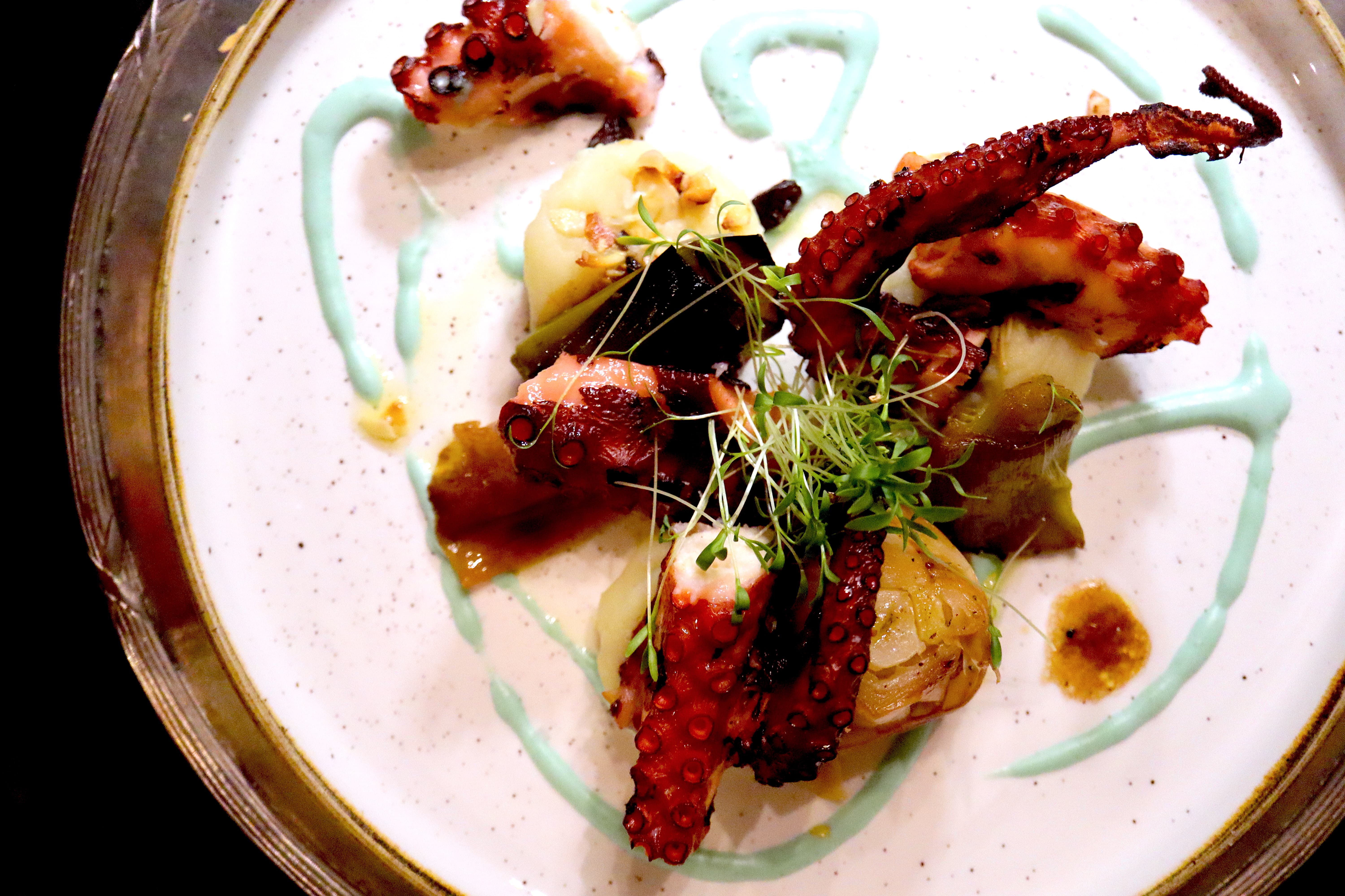 - Polpo alla brace, crema di patate al wasabi, porri e uvetta e mandorle tostate
