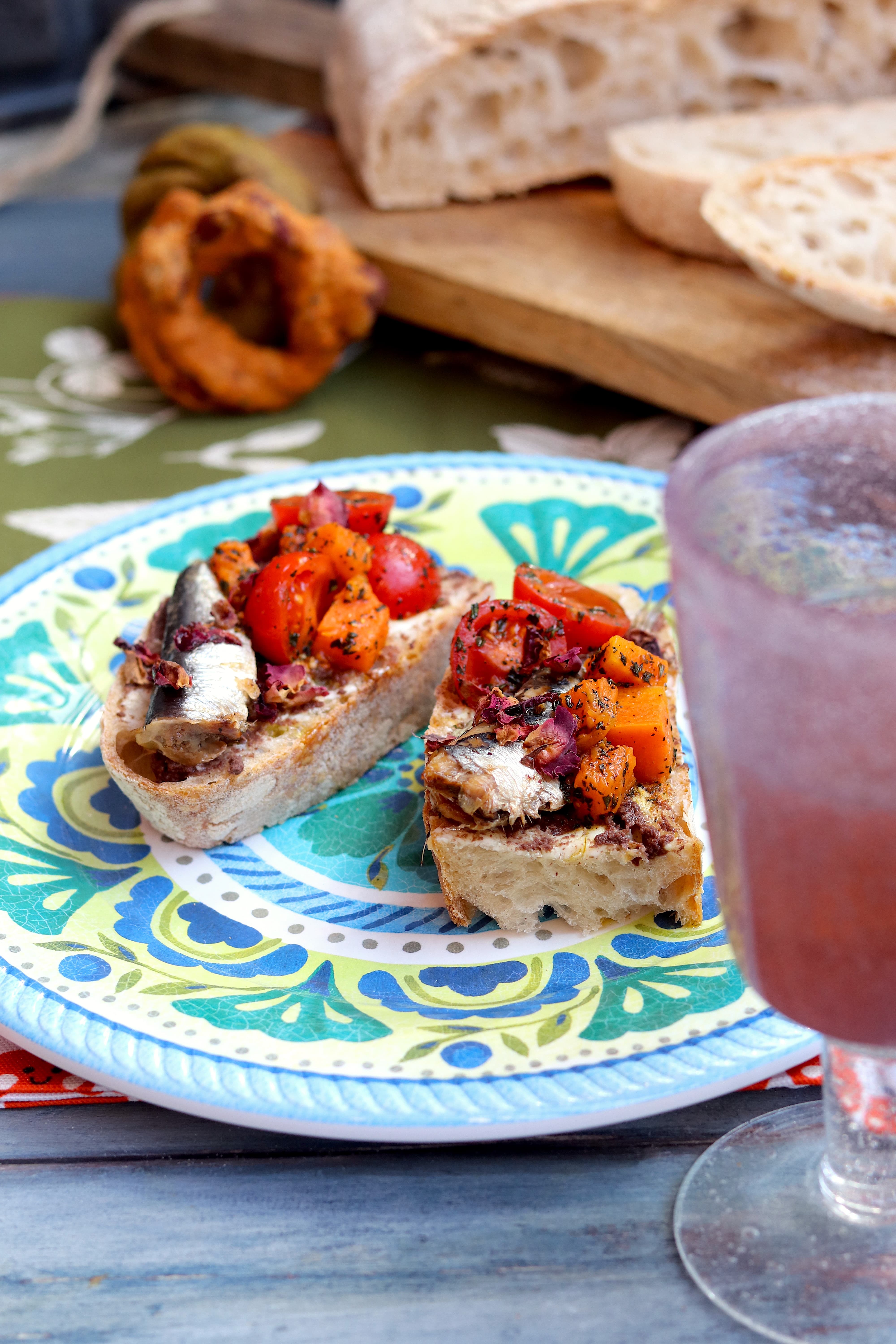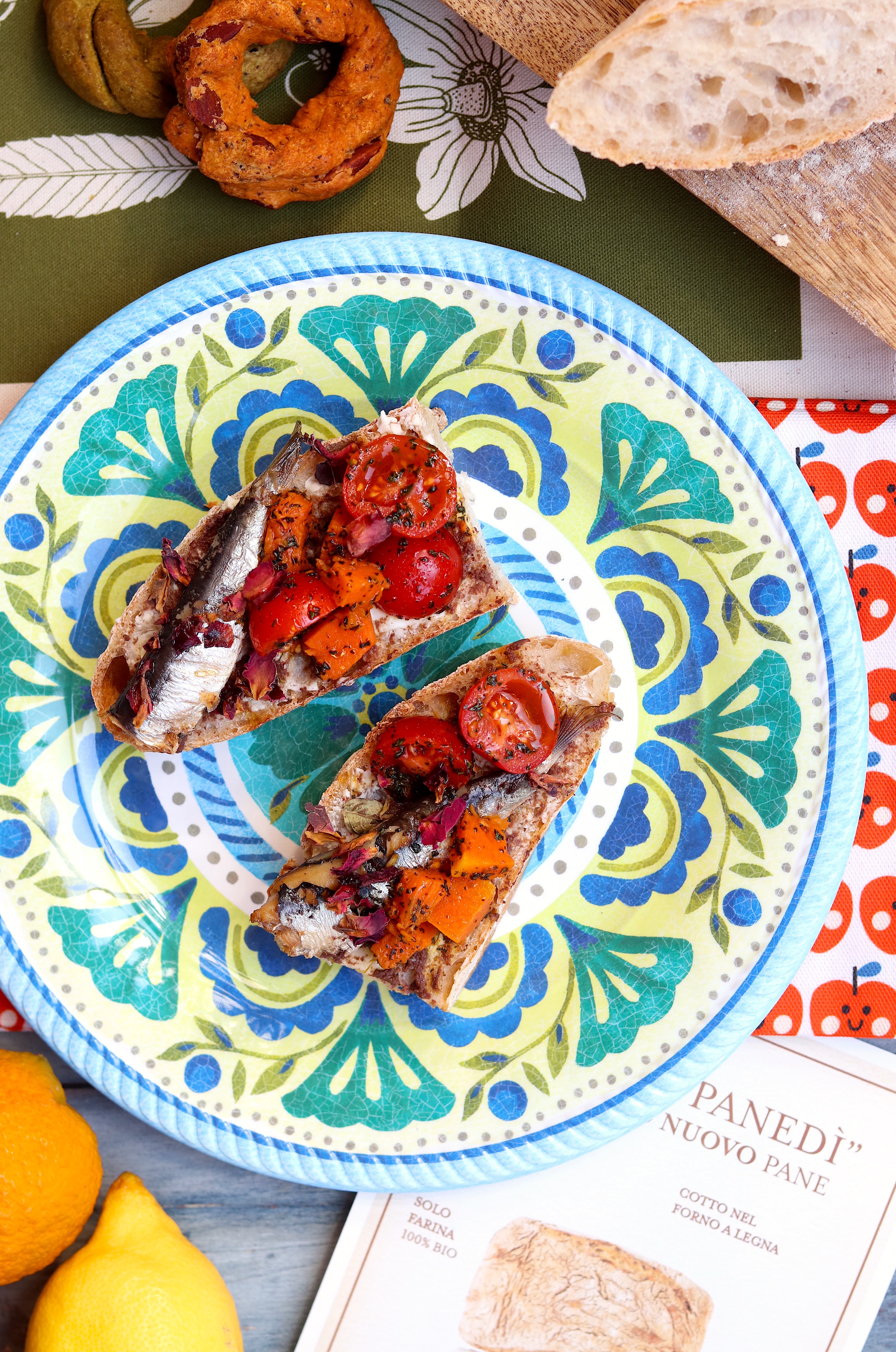 Questa volta gli Smørrebrød parlano di Italia: pomodorini, zucca, patè di oliva taggiasca, le sardine di Anzio e un pane nuovo e antico insieme.