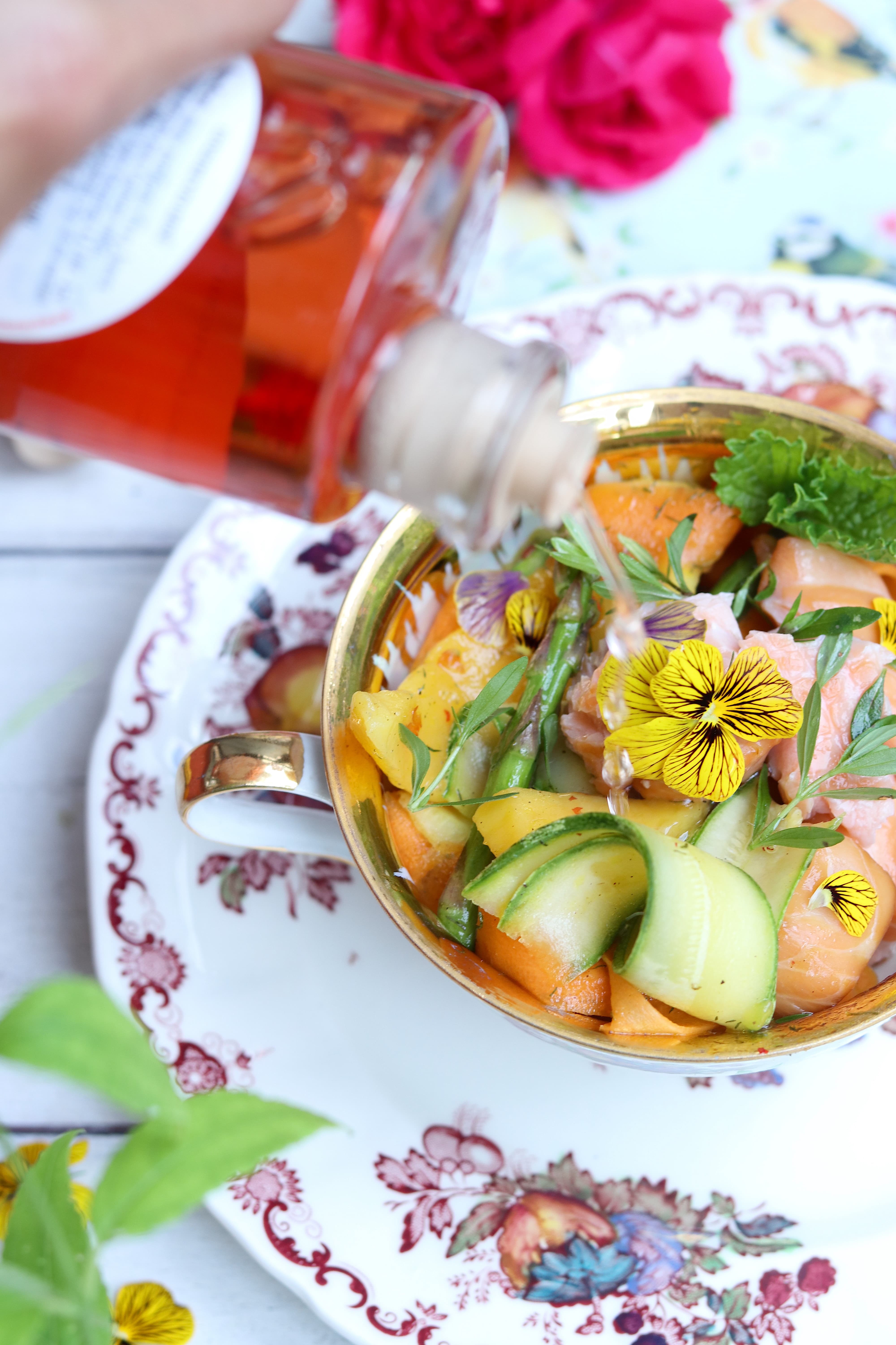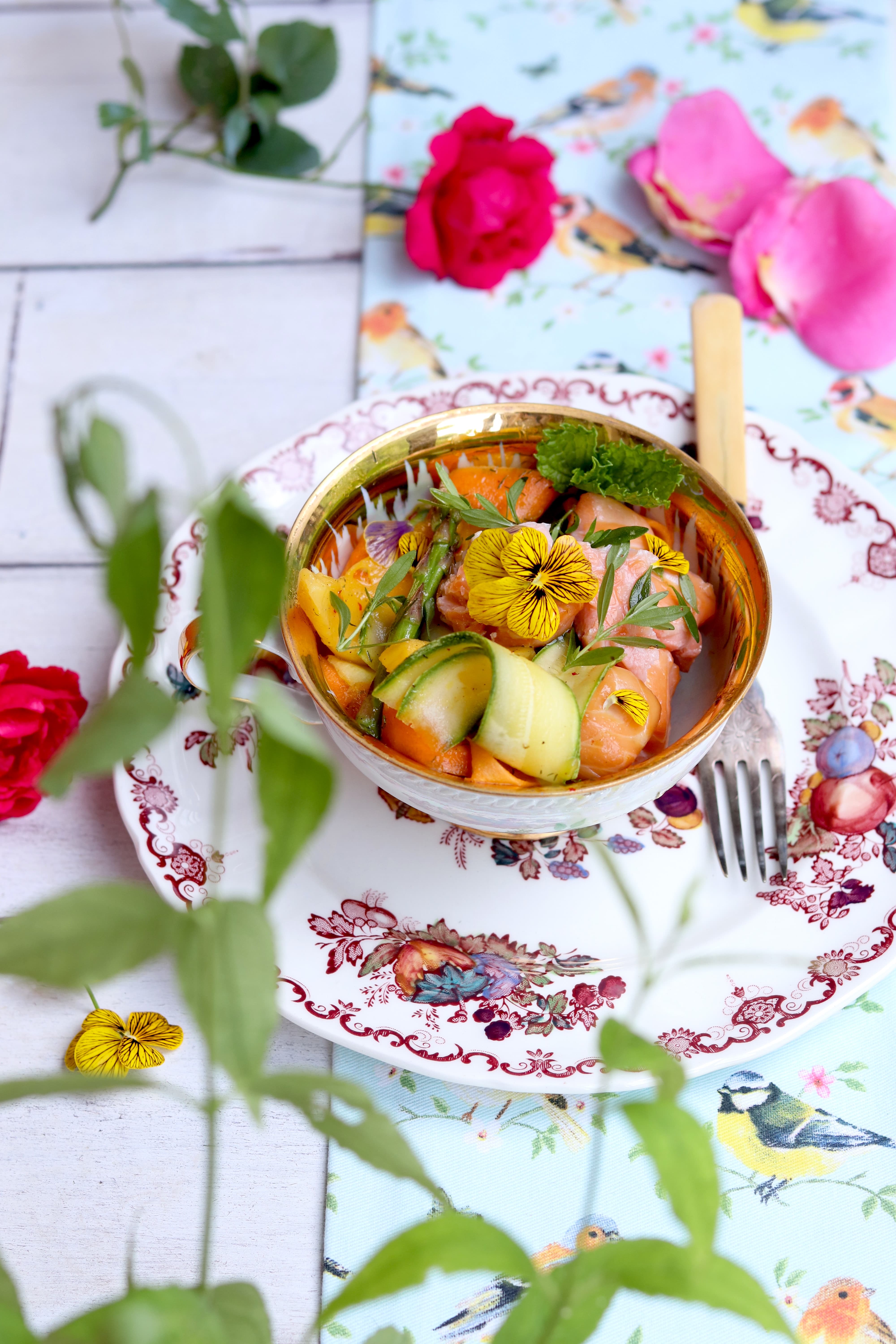 - Componete l’insalata insieme ai pezzetti di salmone, servendola in tazze d’epoca. Decorate con aromi freschi e ancora un pizzico di pepe rosa.