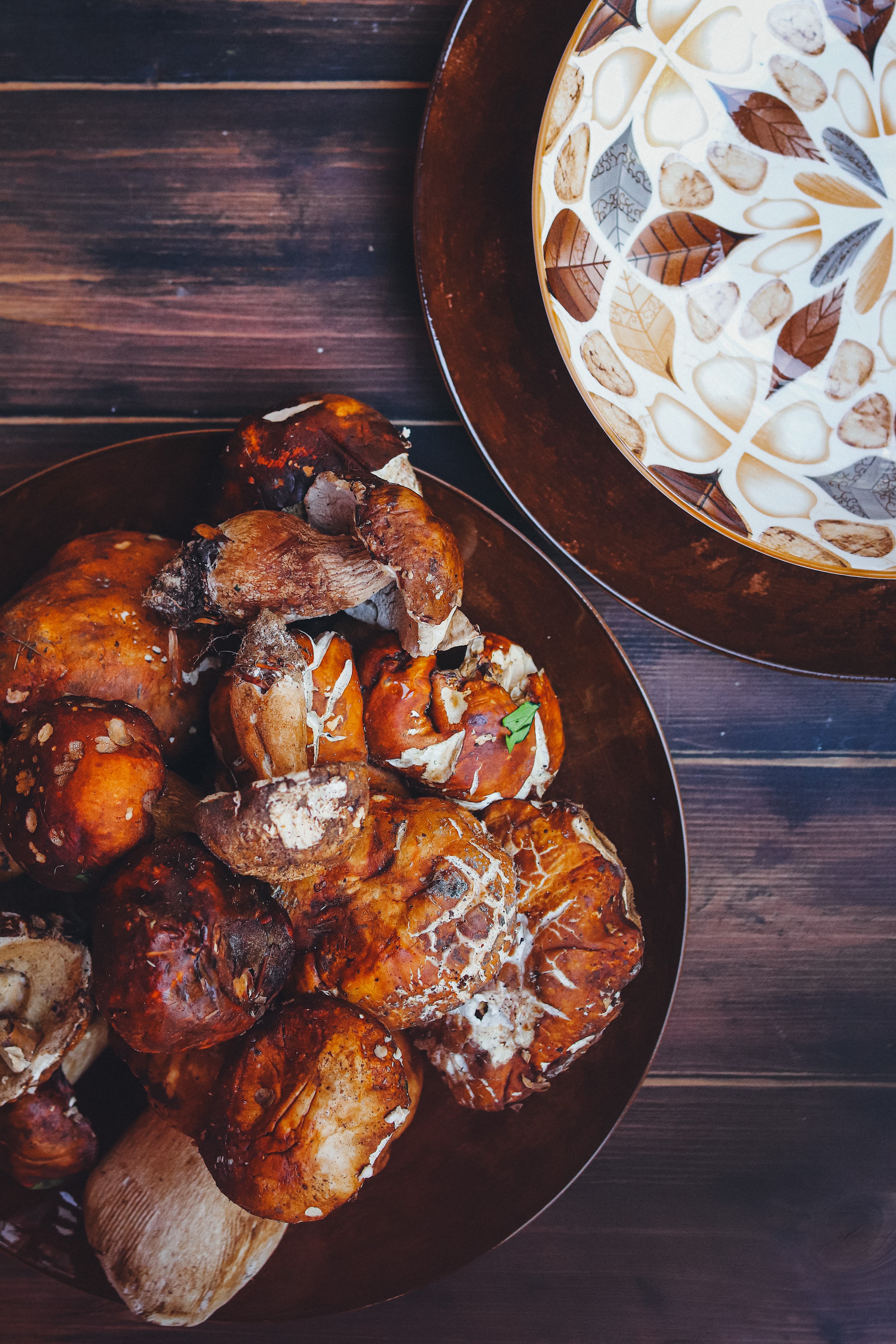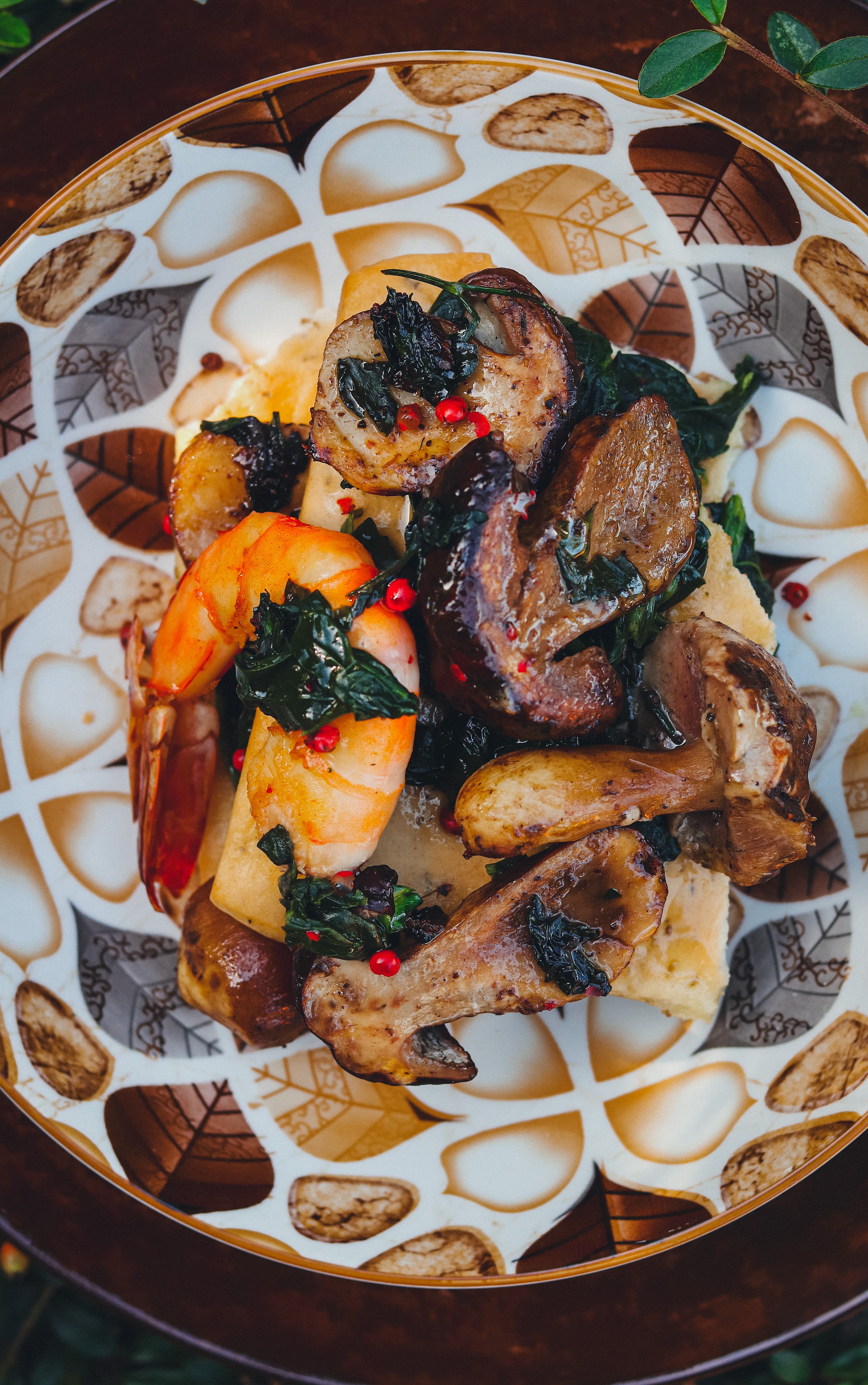 Crostoni d’autunno con porcini saltati all’Armagnac e gamberoni