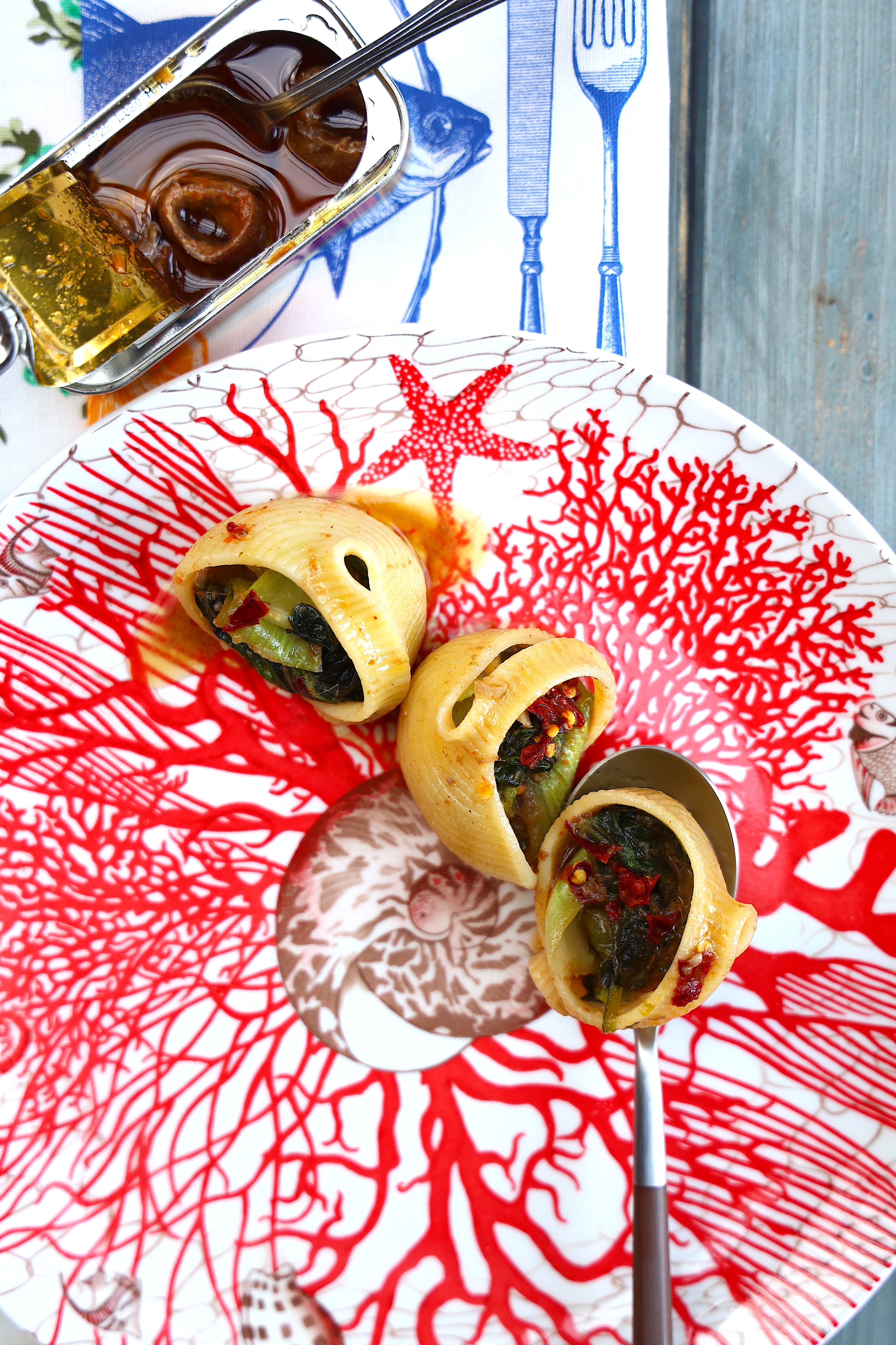CONCHIGLIONI CON PAK CHOI E ACCIUGHE PICCANTI