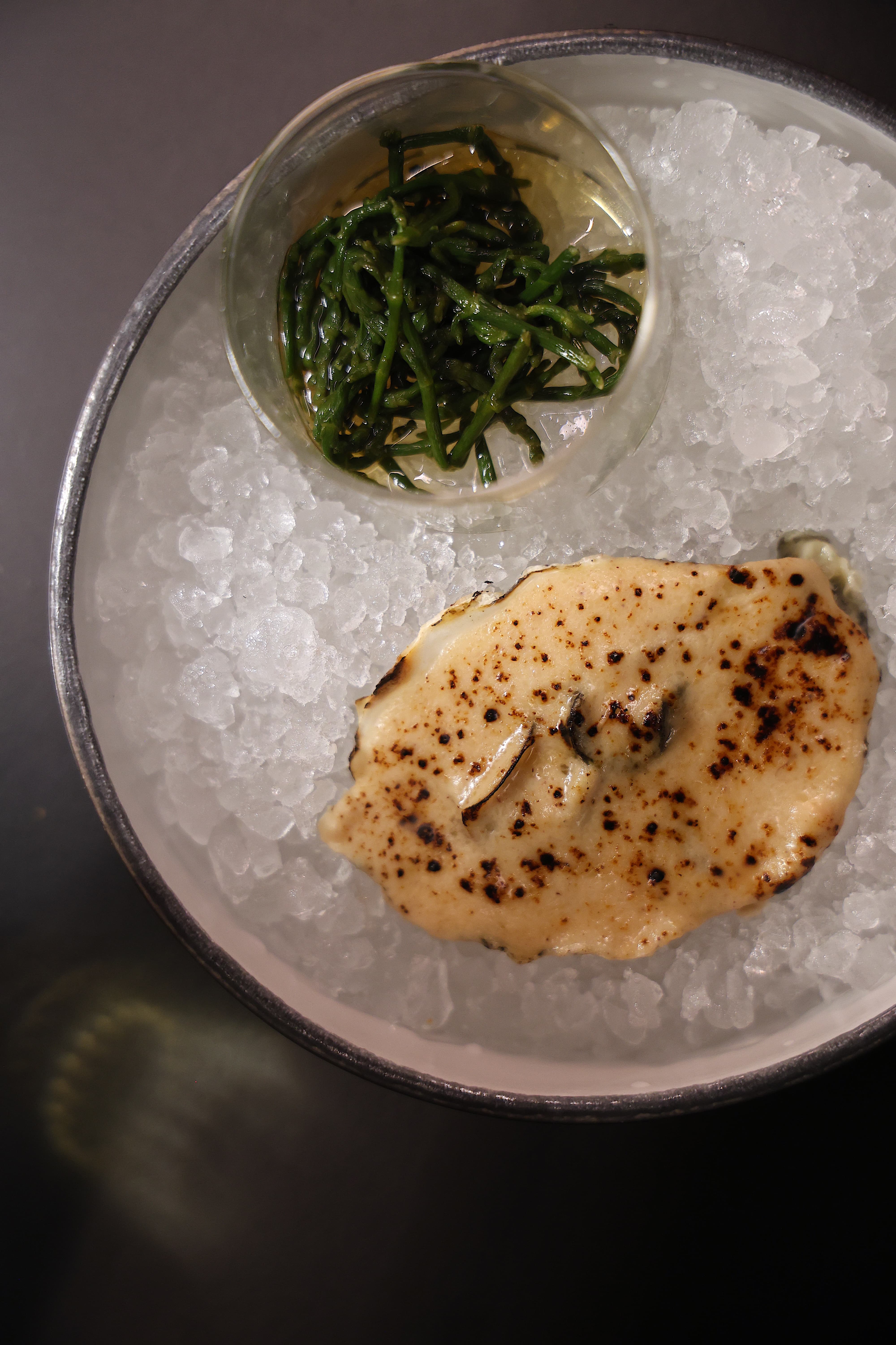 - Ostrica cotta CBT, insalatina di asparago di mare, besciamella al midollo di manzo e acciughe del Cantabrico