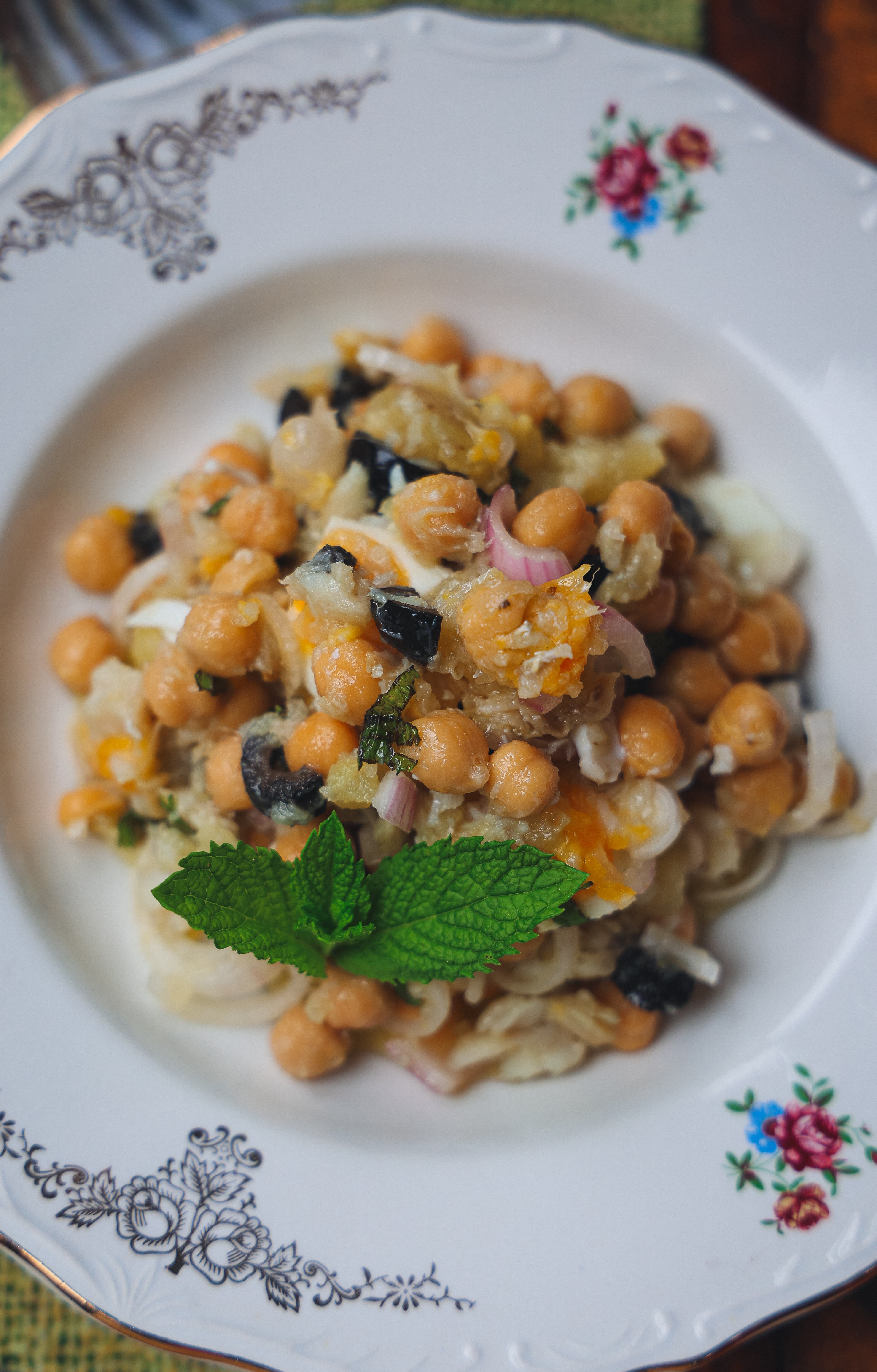 INSALATA DI CECI E BACCALÀ. Con olive nere, cipolla di Tropea, patate, zeste di limone, olio evo, pepe e menta fresca in abbondanza.