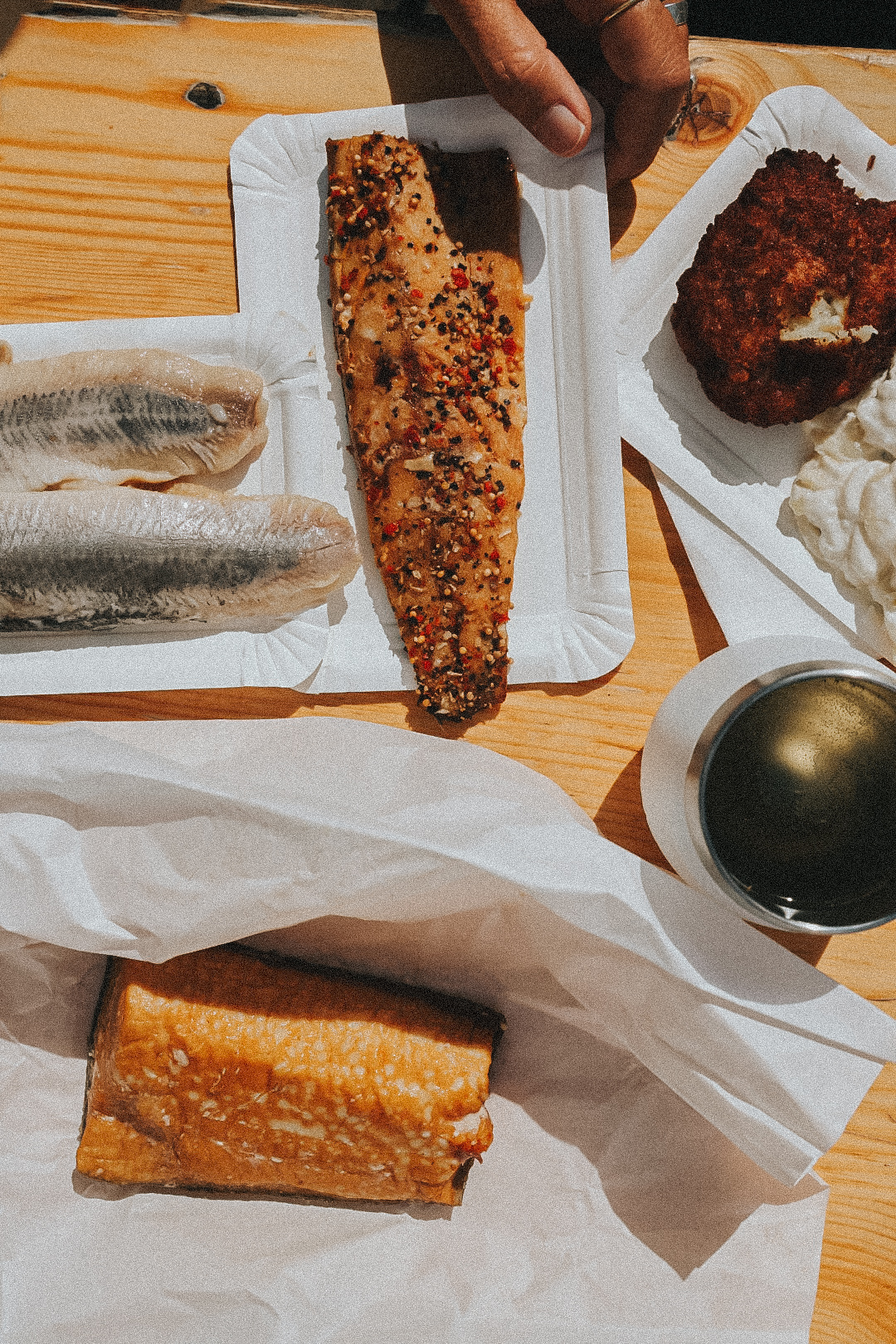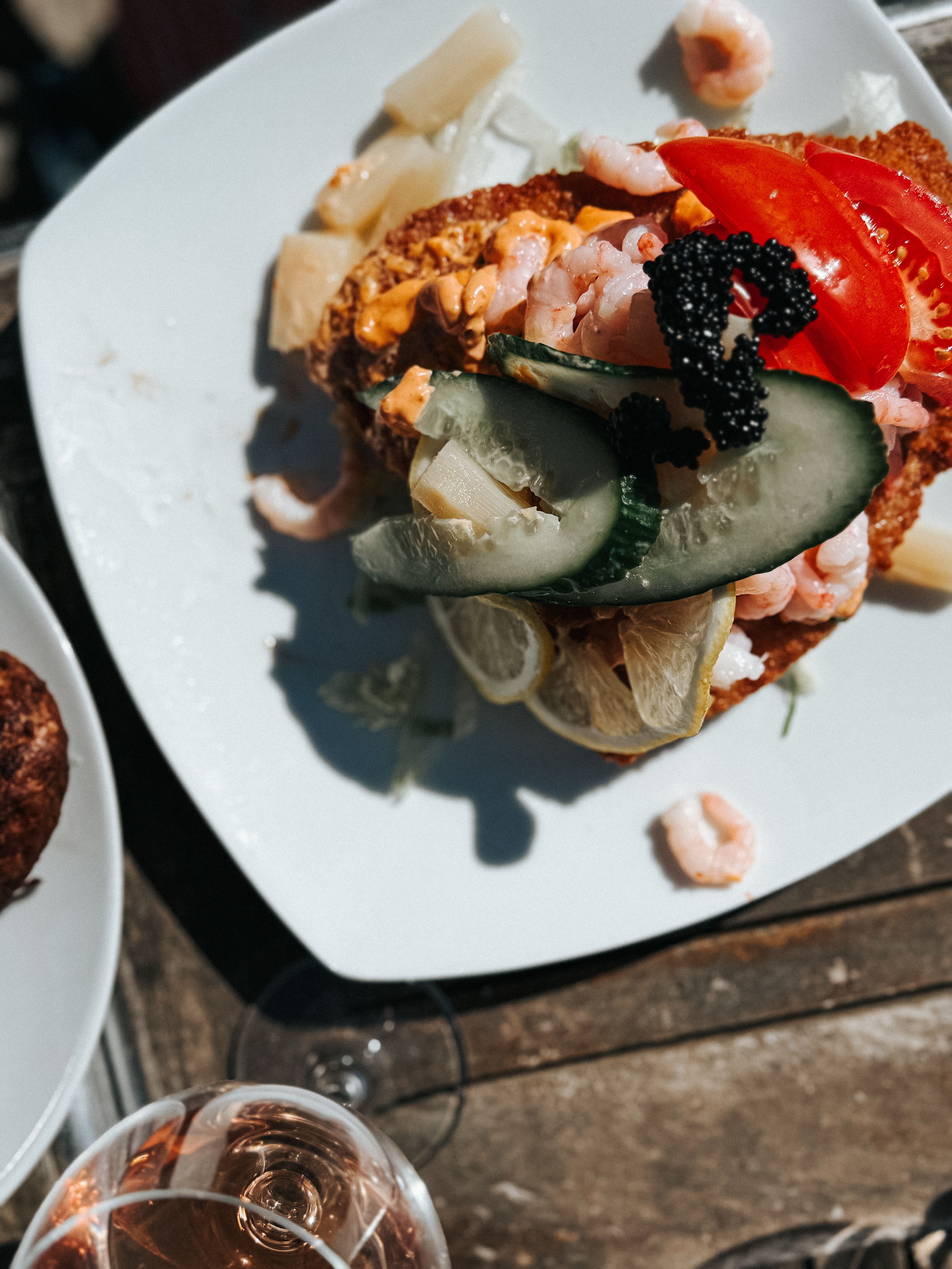 Poi arriva lo Stjerneskud, ovvero Stelle Filanti. Lo ordini e poi capisci perché questo piatto ricordi un cielo stellato: una fetta di pane ai semi [di pane non c’è nulla, sono semi compattati] che ospita due o tre filetti di platessa impanata, salsa in abbondanza e poi una pioggia – anzi stelle cadenti – di gamberetti boreali. Impreziositi da fettine di cetriolo e qualche pomodorino, così, per sgrassare. O forse per renderlo ancora più elegante.